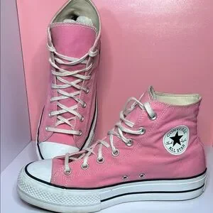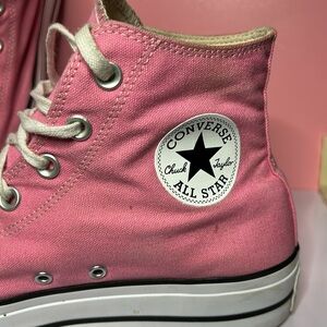 Classic pink Converse high-tops. Iconic design with durable canvas. Perfect for everyday wear.