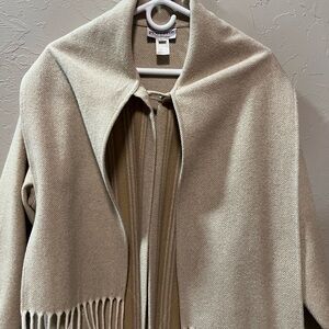 Chic beige cape with tan accents. Features stylish fringe. Ideal for layering.