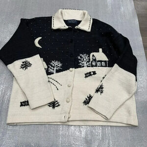 [XL]Rainbow Bridge Winter Scene Embroidered Collared Button Knit Sweater