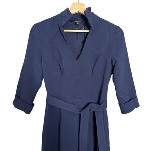 Dress features 3/4 sleeves, stand up collar, v neck and self-tie belt.