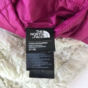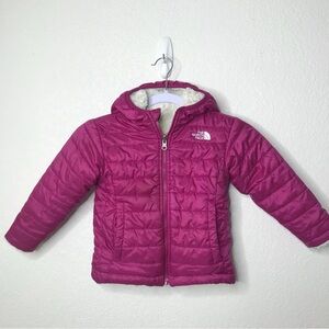Super warm and cozy jacket from The North Face. The Mossbud Swirl. Reversible with a water repellant taffeta on one side and a super soft faux fur/high pile on the other. Full zip front with chin guard. Attached hood with elastic binding. Two pockets. Quilted exterior. Embroidered logo. Deep Pink/Magenta on one side, Off-White/Ivory on the other. Polyester. Underarm to Underarm - 13 1/2”; Length - 15 3/4”. All measurements approximate. Very Good pre-owned condition.