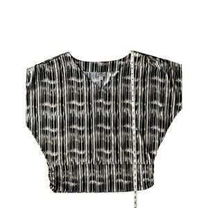 This Worthington top features a professional black and beige striped pattern with a relaxed fit, suitable for office or casual settings. The short sleeves and soft stretch fabric make it comfortable for all-day wear. Ideal for pairing with trousers or skirts, it's a versatile addition to any wardrobe.