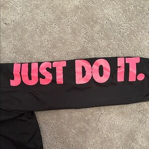 Nike windbreaker with bold pink 'Just Do It' text. Hooded design with pink interior lining. Some wear in the arm lettering, see picture.