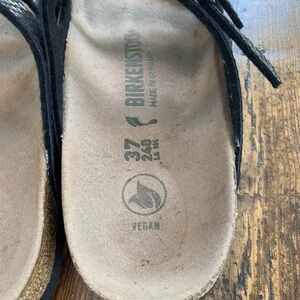 Beautiful authentic Birkenstock sandals. Metallic snake skin pattern. Vegan foot bed. Size 37. Barely worn. They show minimal signs of wear and have a lot of life left in them!