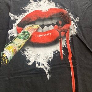 Make a statement with this edgy black t-shirt featuring a striking red lips and money graphic. Perfect for adding a bold touch to your casual wardrobe.