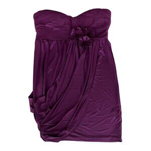 This elegant strapless cocktail dress, in a rich burgundy hue, features a flattering sweetheart neckline and charming floral applique. The draped skirt adds a sophisticated touch, making it suitable for formal events. Its design ensures a graceful silhouette, providing both comfort and style.