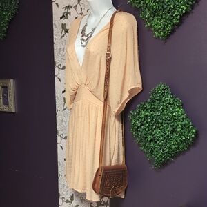 Step out in style with this chic peach komono/ Bat Wing style sleeve textured mini dress.
