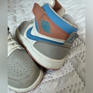 "In good used condition. Freshly laundered and cleaned up. Ready for new child to wear. Brand new laces. Pink blue and white in colour. Nike Jordan 1 toddler preschooler running shoes. High top basketball sneakers. EU size 27. Size toddler 10/10.5C. Regular wear and tear throughout the shoes. You may want to replace the insoles. Ive washed them twice and they are not spotless. No original box. Selling for a family member. Need measurements? Please just ask. Smoke- and cat-free household.