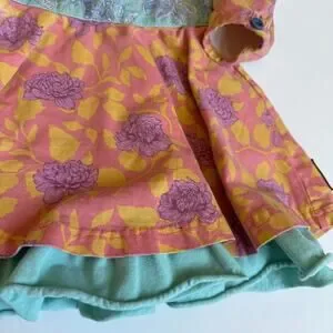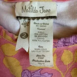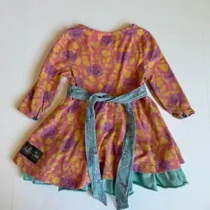 Size 2, Matilda Jane, Citronella Dress from the Secret Fields collection. Pink, purple and yellow floral print with blue floral sash that ties in the back and blue ruffle. Play condition for paint stain on the chest. Otherwise, light wear.