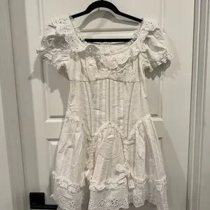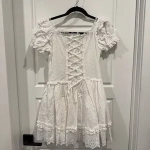 Cute white eyelet mini dress perfect for your cottagecore aesthetic. Features delicate lace details, corset lace ups and a flattering fit.