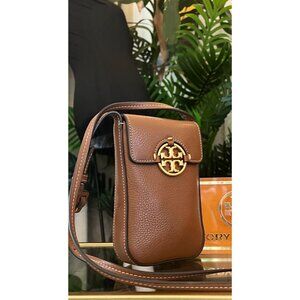 Elevate your style with this Tory Burch leather crossbody phone bag. Its timeless design and practical size make it a versatile accessory. Perfect for keeping your phone and essentials secure, this bag boasts a rich brown tone and signature logo detailing. Enjoy both elegance and functionality in one stylish package.