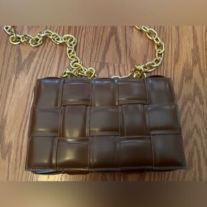 Stylish brown bag with a bold gold chain. Perfect for any occasion.