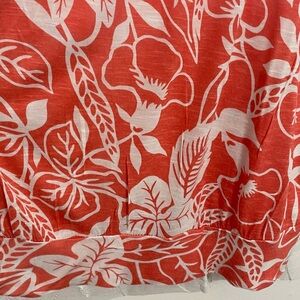 Vibrant coral top with floral design. Features ruffled neckline. Ideal for casual wear.