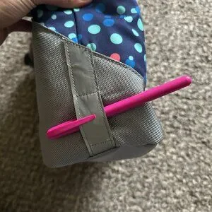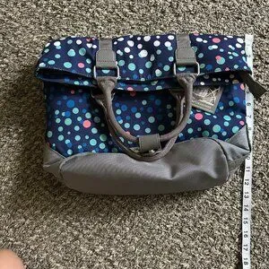 New with tags- the discontinued Bubble collection. Has a sleeve that could fit a tablet and one BIG pocket on the front zipper (see the picture where the measuring tape does not go all the way to the bottom and that is the measurement of the pocket. The side reflective panel is a "loop" so you can clip on a light (see picture with the pen). There is a strap to use as a cross body and it slips in a designated pocket in the back for easy transformation on and off the bike. The ring/clip attaches to the rear bike frame so that there is no bounce. The bubble material is "weatherproof" per the tag. I tested it- some water rolls off, but I wouldn't say things would stay dry in a storm.