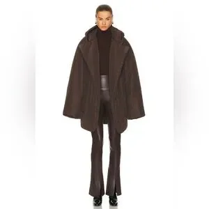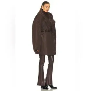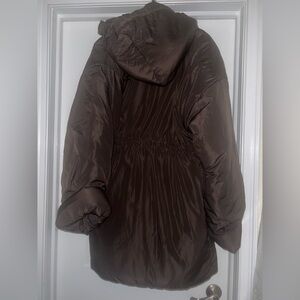 Chic brown puffer jacket by Norma Kamali. Features a cozy hood and oversized fit. Ideal for cold weather.