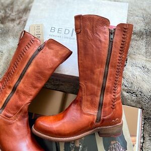 Contrast whipstitching adds a pop of color to a mid-calf boot shaped from genuine leather with a rich, vintage finish.