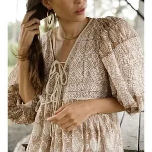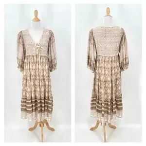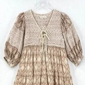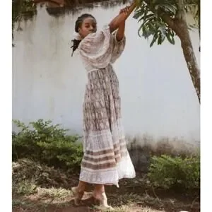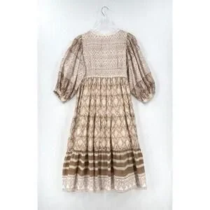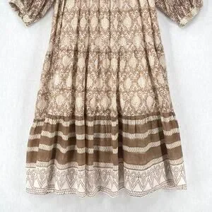 DAUGHTERS OF INDIA Jasmine Midi Dress Women Small White Brown Block Print Cotton