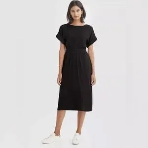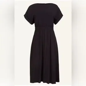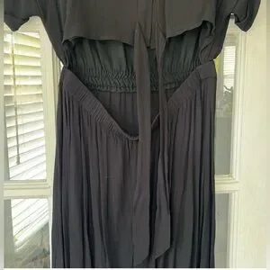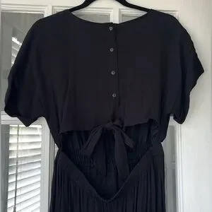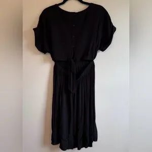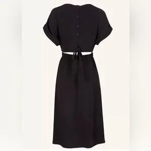 Stylish black dress with button-back cut out design. Features a chic tie at the waist. Ideal for any occasion.
