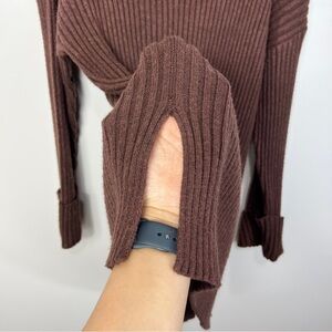 Features: Long silhouette sweater. Ribbed design. Roll neck. Turned up cuffs on sleeves. Slits at sides of hem. Dropped shoulders.
