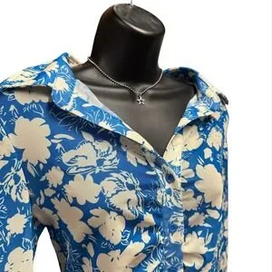 Keywords: Y2K style, mesh top, ruched button top, large top, blue floral top, offwhite floral top, festival top, rave top, 2000s fashion, vintage inspired, throwback fashion, retro chic, trendy outfit, iconic style, Y2K fashion
