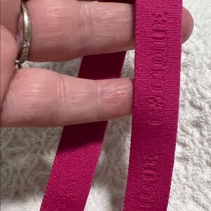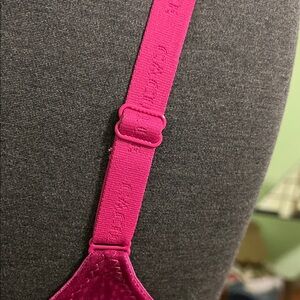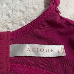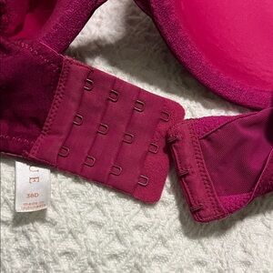 Chic fuchsia lace look bra with supportive cups. Ideal for daily comfort and style. Lightly lined T-shirt style with underwire, fully adjustable straps, bow detail on front and 4 rows of 3 hook/eye closures on back. Size 38D.