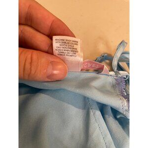 A flirty and sexy baby blue satin slip dress with periwinkle lace accents. Feminine, romantic, ethereal. V-neck, adjustable spaghetti straps, tie back, short length. In good vintage condition with several areas of snagging, as seen in the photos. No stains or holes noted.