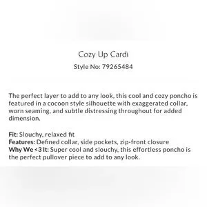Really beautiful piece year round - zips up the front, reverse seaming throughout, and as the name indicates - it’s very cozy!