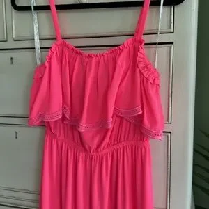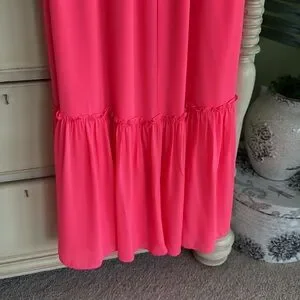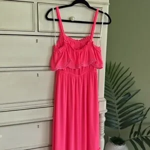 Bright pink maxi dress with ruffle details. Perfect for summer outings.