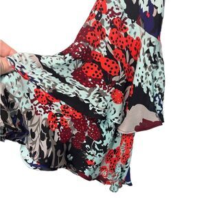 Parker silk romper in Congo, deep neck with modesty snap, pockets , double bell/flare sleeve