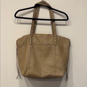This tan leather tote from HOBO combines elegance with practicality, featuring a soft matte finish and decorative fringe details. Its spacious interior and long shoulder straps make it an ideal choice for everyday use, offering both style and functionality.
