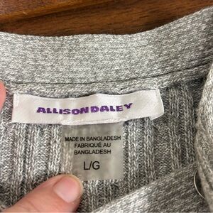 Cozy and timeless, this Allison Daley light gray ribbed knit sweater in size Large features a classic crew neckline with chic button detailing at the shoulder, 3/4 sleeves, and a flattering relaxed fit. The ribbed texture adds style and warmth, making it perfect for fall layering, winter wear, or a casual spring transition piece. A versatile neutral that pairs well with jeans, skirts, or slacks for work-to-weekend wear.