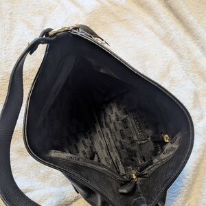 Elegant black shoulder bag by Michael Kors. Features sleek gold hardware. Ideal for versatile styling.