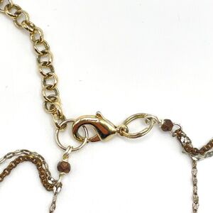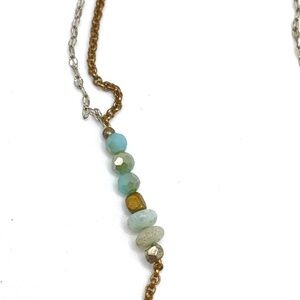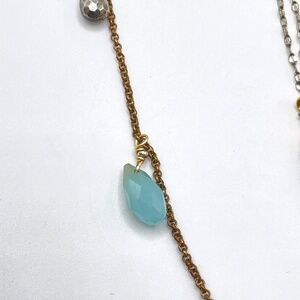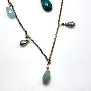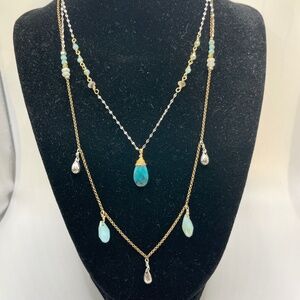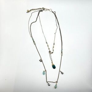 Lucky Brand fine gold tone chain and acrylic drops necklace. This is a very feminine bohemian style necklace with a layered design of fine gold tone chains with acrylic turquoise and amazonite color acrylic drops. Features the Lucky Brand hang tag. Lobster class clasp. The drop on the shortest chain is about 7 1/2" and there is 2" of extender chain for adjustability. Pre-owned. Lightweight.
