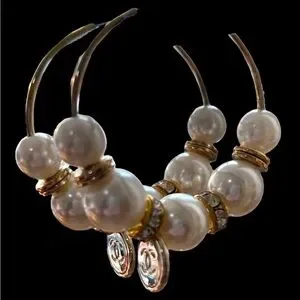 Make a statement with these oh-so-chic upcycled earrings featuring the iconic CHANEL “CC” logo in gold-plated over stainless steel, layered between elegant faux pearls & CZs set in gold-plated over stainless steel, all strung on large gold-plated over stainless steel hoops. Approx 5 1/4” around the outside, including beads/charms. Perfect for any occasion.