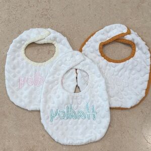 One size fits all bibs with snaps. 3 total. New. Keep your little one clean and stylish with this personalized baby bib set. Featuring rust, yellow and white colors, these bibs are perfect for any occasion. Soft and comfortable for your baby.