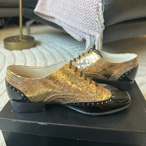 Luxurious CHANEL wingtip lace up oxfords in gold and black. Stylish and elegant design. In perfect condition. The gold is meant to look oxidized. Rarely worn and it’s a shame for me to keep stored in my closet when someone else can truly enjoy these.