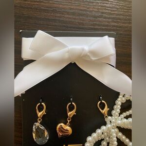Heart charm, crystal charm, pearl bow and ribbon bow tie