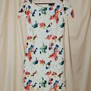 Crisp white sheath dress with vibrant neon splashes of watercolor. Chunky lace overlay with unlined lace short sleeves. Knee length with a round neckline.