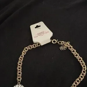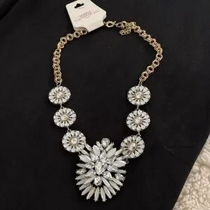 This stunning statement necklace features a blend of gold and silver tones, perfect for adding a touch of elegance to any outfit. The intricate design and sparkling accents make it a must-have accessory.