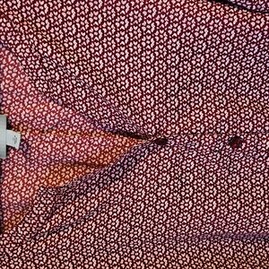 Catherine's Red and white patterned v neck button down blouse with ties at the wrist. 100% polyester. In EUC. Length is 32 and pit to pit is 29 inches