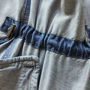 Chic denim jacket with zip closure. Features front pockets and adjustable gathered waist. Ideal for everyday style.