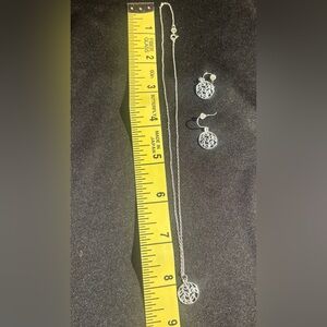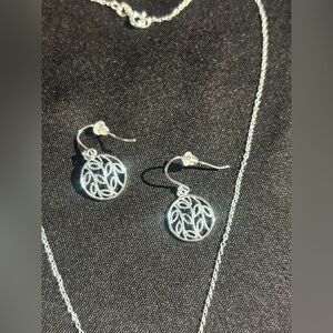 This stunning silver necklace and earring set features intricate designs, perfect for adding elegance to any ensemble.