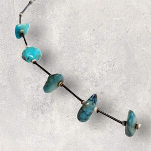 A timeless Southwestern classic! This vintage 16 liquid silver necklace features sleek sterling tubes accented by seven natural turquoise chips in varying shades of blue green. Lightweight and comfortable, its perfect for layering or wearing solo for that effortless boho look.