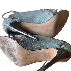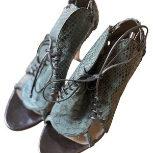 ls, python heels, open toe stilettos, green teal aqua, designer heels, Vero Cuoio leather sole, EU 36 US 6, runway heels