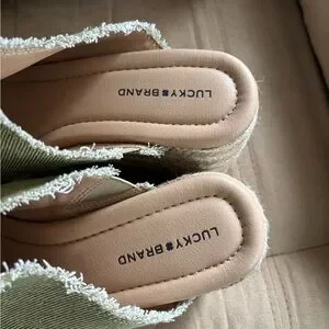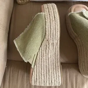 Chic olive green wedges with a jute platform. Ideal for everyday style. Heel 4 inch