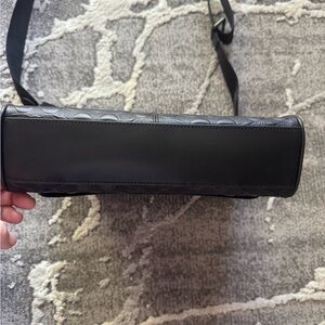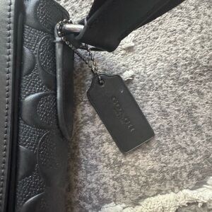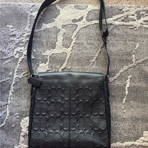 Sleek Coach crossbody bag in black. Features signature pattern and adjustable strap. Perfect for everyday use.