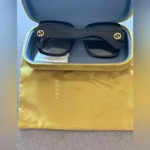 Stylish Gucci sunglasses in glossy black. Features gold accents. Includes a soft yellow case. Never been worn!! New without tags!!! Purchased from Nordstrom. Guaranteed authentic.
