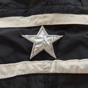 Stay stylish on the slopes with this black and white ski jacket featuring bold star accents. Perfect for winter adventures. Excellent condition