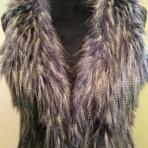 Stylish faux fur vest. Soft and luxurious texture. Perfect for layering. RN 85706, CA 171311, 60% acrylic, 40% polyester. Measurements when flat: 19” pit to pit, 25” shoulder to end hem. Note- this is navy blue and silver- the pics look purple.