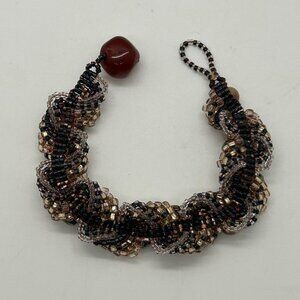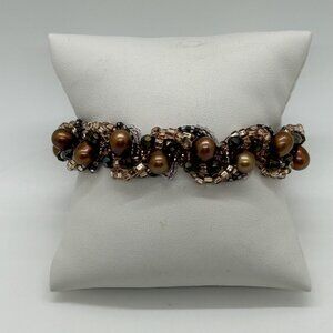 Vintage Woven Beaded Bracelet With Freshwater Pearls & Carnelian Bead Accent
